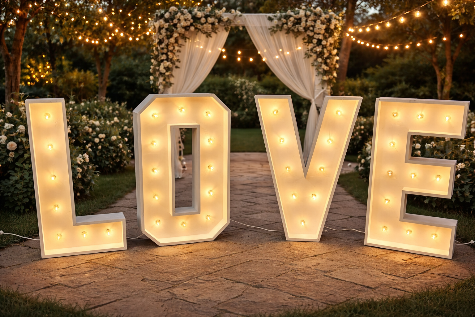 Our Signs Illuminated Signs We have custom and unique signs to choose from $45 / per day Rustic LED Neon “Saloon” sign40″ x 11″120v outlet required $25 / per day Rustic LED Neon “Bar” sign24″ x 8.5″120v outlet required $45 / per day LED Neon “Mr & Mrs” sign36″ x 9.5″120v outlet required $25 / per day 3-Piece LED Neon “Mr & Mrs” sign“Mr” – 10″ x 7″“&” – 4″ x 4.5″“Mrs” – 11.5″ x 7″USB outlet required $50 / per day, per letter. No delivery included. Discount available if you rent all four letters “LOVE”. 36″ tall each120v outlet required Non Illuminated Signs We have custom and unique signs to choose from Custom sign. Call for Price. Rustic LED Neon “Saloon” sign47″ x 7.5″ $25 / per day Rustic Handpainted “Mr & Mrs” on distressed wood40″ x 5.5″